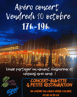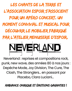 - le 10 octobre: apéro-concert en partenariat avec le foyer Espoir et le groupe Neverland, au programme : du Rock, du mobilier solidaire, fougasses et soupes.
